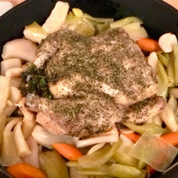 The recipe below was made in an 8 qt. slow cooker and finished in the oven. It is my riff on a classic French chicken stew with tons of veggies, fresh herbs, and flavor. It’s a two-step cooking process, but I promise you the chicken will be super moist and the skin nice and crispy.