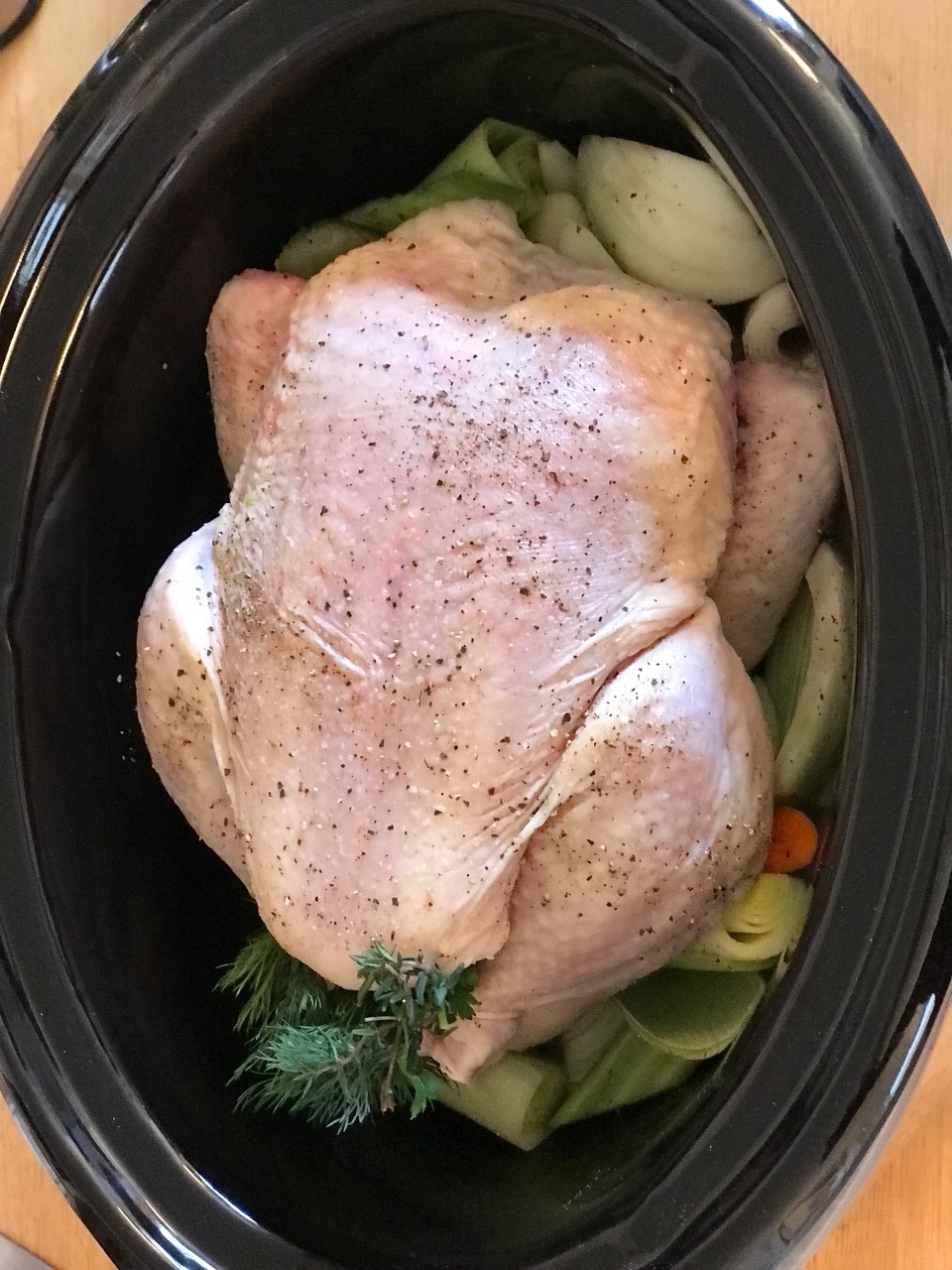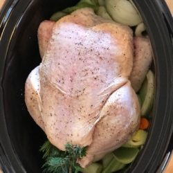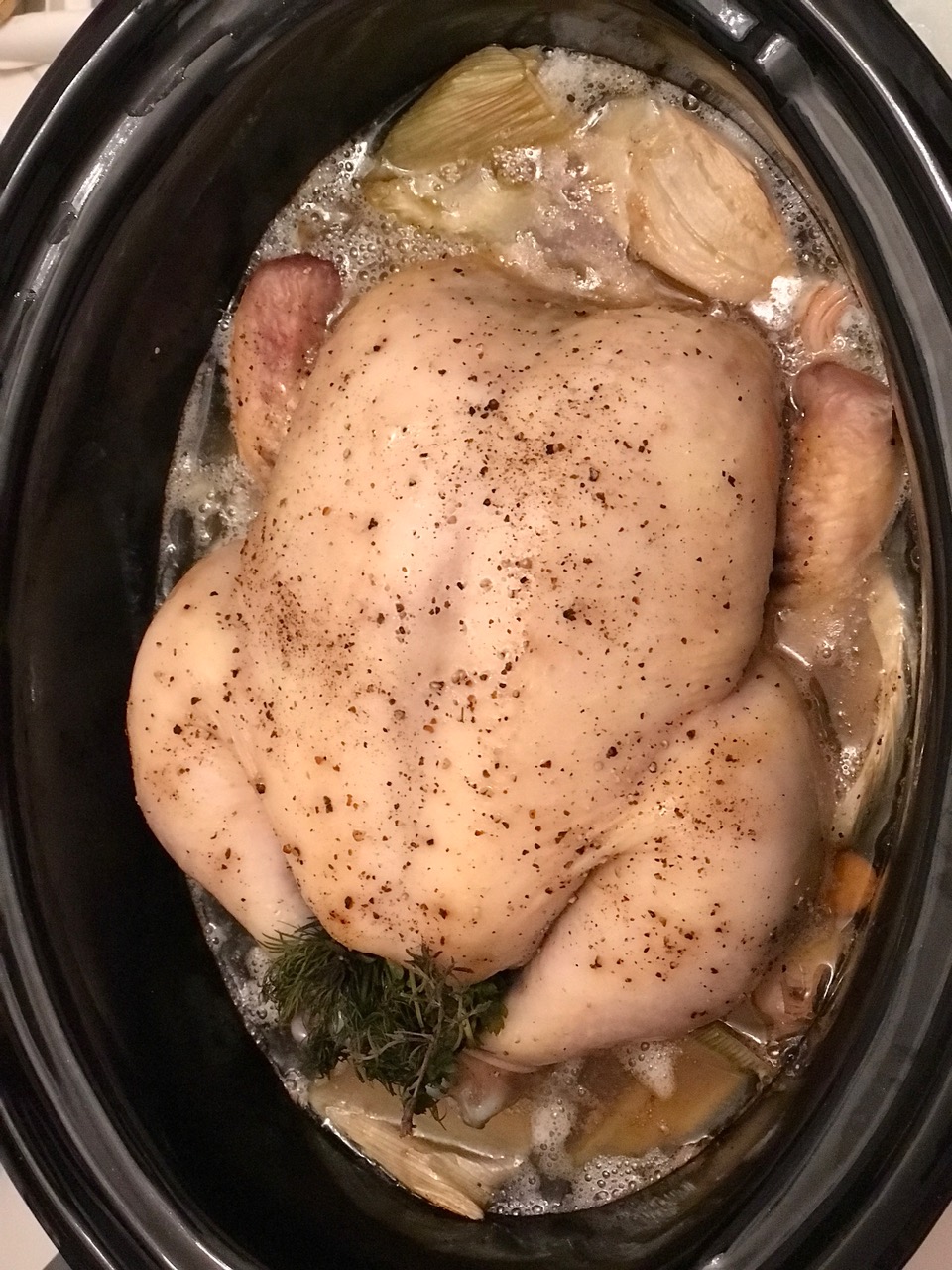 Put the fresh herbs in the chicken’s butt with about 1-2” sticking out and tie the legs together. Also, fold the chicken’s wings back behind her neck. Put the chicken on top of the veggies in the slow cooker and nestle her in there with some of the veggies around.