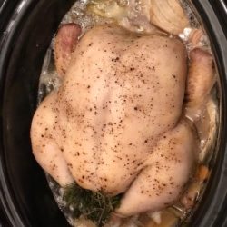 NOTE: If you have a smaller slow cooker, you can certainly adjust the ingredients so that everything can fit. If you are trying to use a 4 qt. slow cooker or less, try a Cornish game hen. If you do this, I would cut the cooking time to 2-3 hours. Please check you slow cooker recipe book for the exact time. Remember you want to undercook it, so that you can finish in the over.