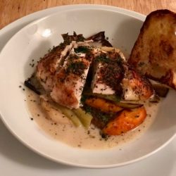 To serve, I like to use a shallow bowl and add some of the veggies with sliced chicken breast of a leg and thigh on top. Ladle sauce over chicken and garnish with fresh herbs. I like to serve this dish with crusty bread and a side salad.